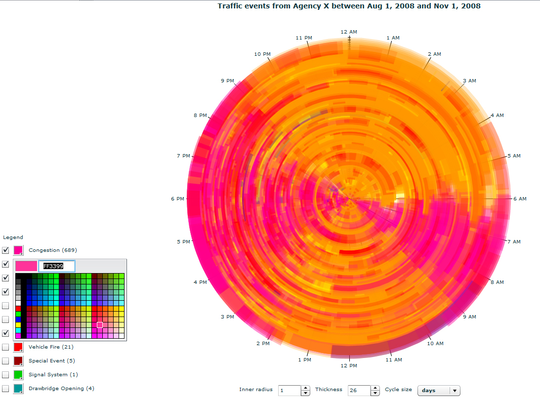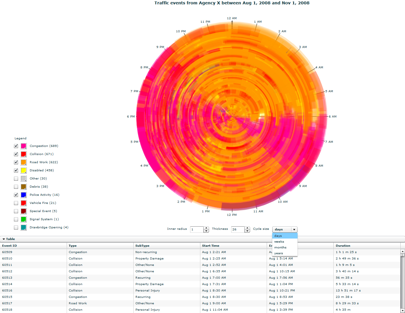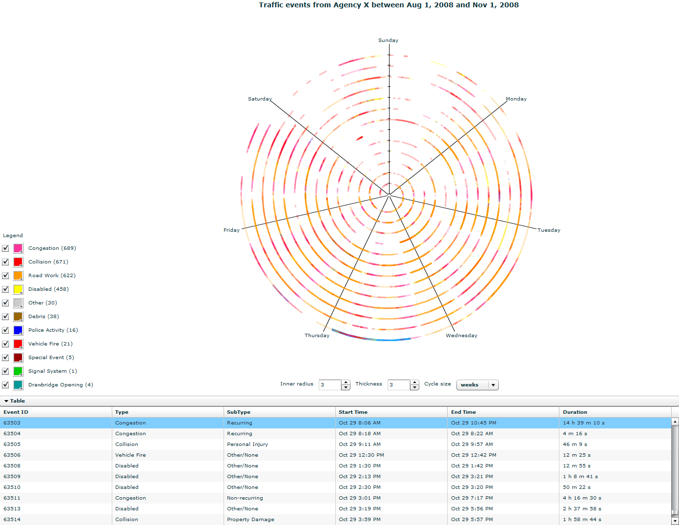 All incidents recorded in VDOTIM from March 2005 to November 2008 plotted on a Spiral Graph with a week-long cycle size.